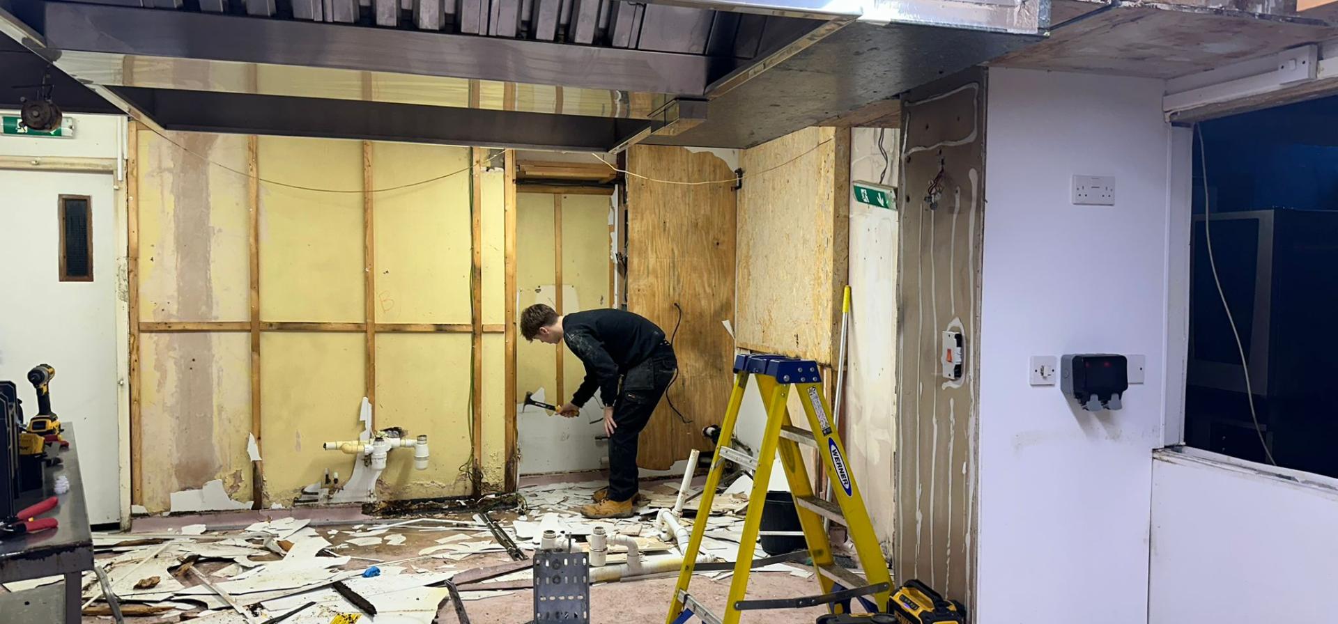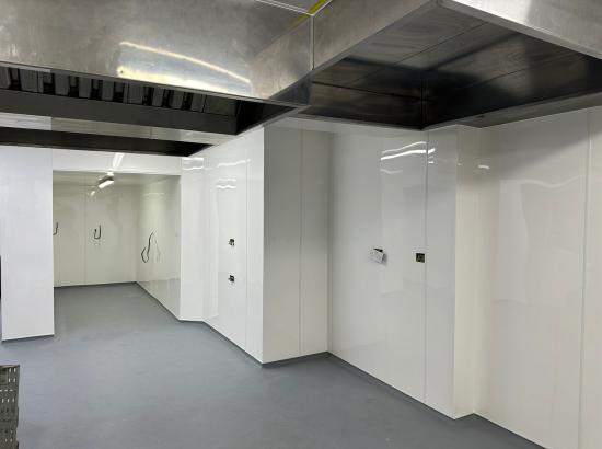 The work involved the removal of the internal walk-in fridge, stripping back the ceilings and walls to gain access to the back panels. Our in-house builder then packed out the walls and ceiling with MDF boards ready for the installation of the new white food plastic wall cladding and PVC food-grade ceiling cladding. The kitchen now satisfies EHO guidelines and is simple to clean after a heavy service.
