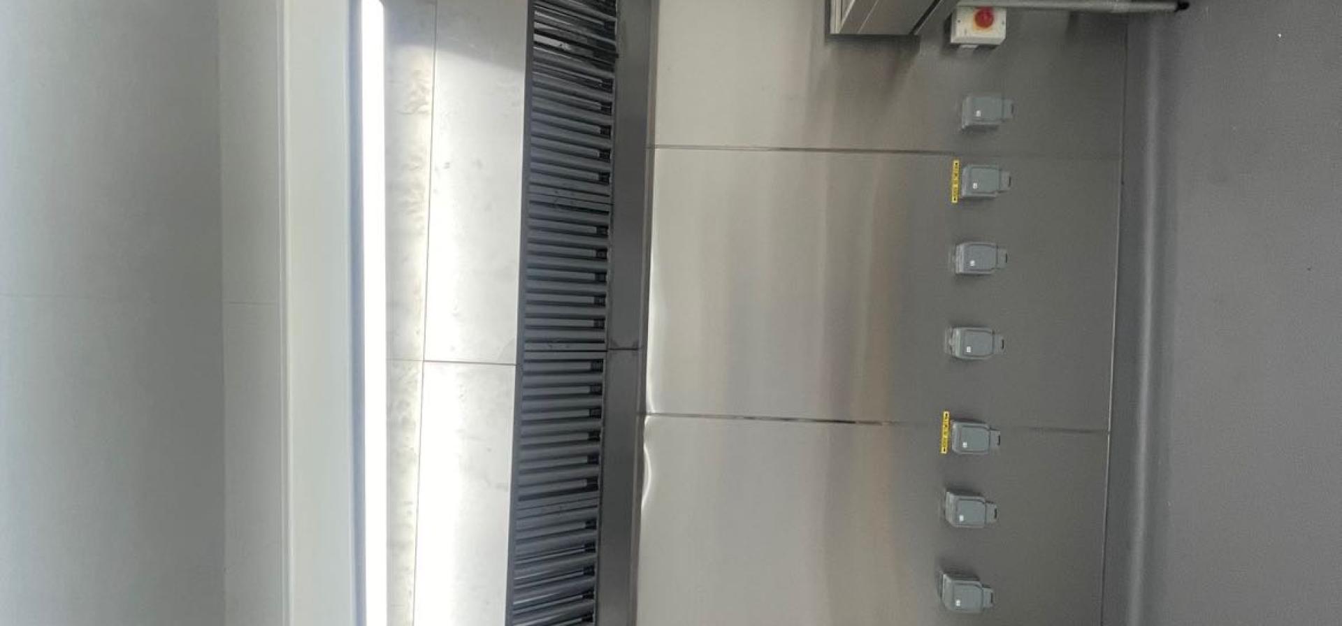 We provided and installed all new white grade plastic and stainless-steel wall cladding as well as UPVC food grade ceiling cladding. In addition, we fabricated the canopy extraction hood and ductwork outside of the building that meets the Health and Safety requirements in the kitchen.