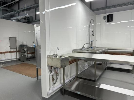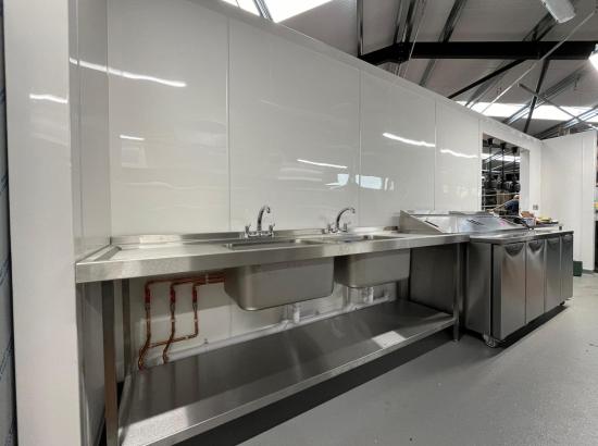 To begin the project our in-house builder constructed a wooden framework to establish the kitchen layout. This foundational step was crucial for determining the placement of various kitchen sections. With the layout set, we proceeded to supply and install the stainless steel and white plastic wall cladding, ensuring durability and ease of maintenance.