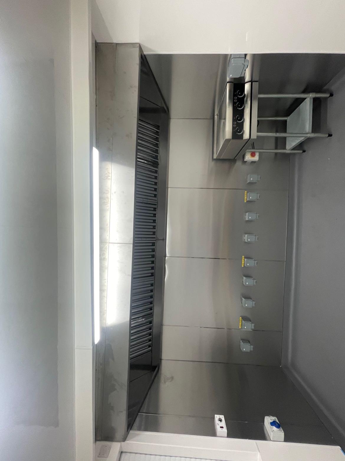 We provided and installed all new white grade plastic and stainless-steel wall cladding as well as UPVC food grade ceiling cladding. In addition, we fabricated the canopy extraction hood and ductwork outside of the building that meets the Health and Safety requirements in the kitchen.