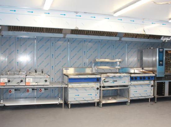 Project elements included the supply and installation of white food grade plastic and stainless-steel wall cladding for the main kitchen, bakery kitchen and ware washing area. We also designed and fabricated a brand-new canopy and ductwork system for the cook line and installed the new gas cooking equipment. Additionally, a new ware washing area was built with fabricated tabling, shelving and a new pass-through dishwasher.